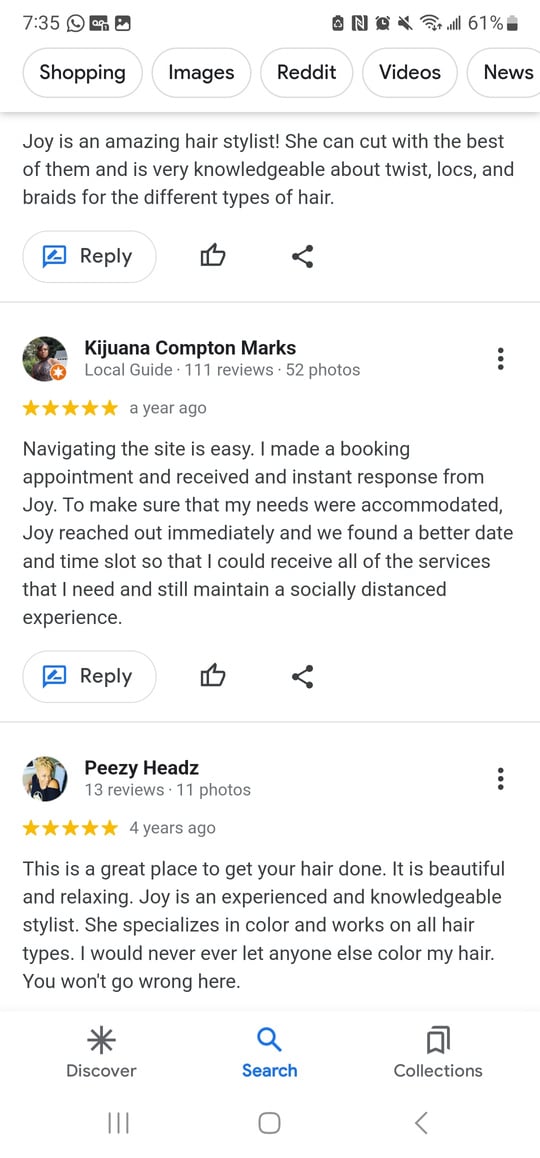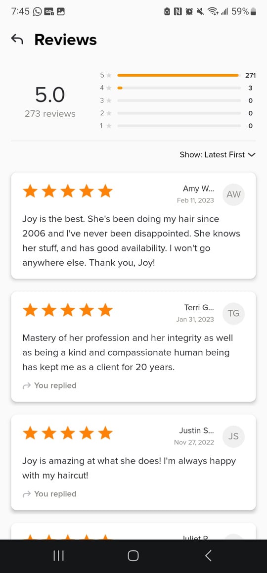 Both of her parents were professional athletes who stressed the importance of paying attention to detail, which became one of Joy's superpowers in executing desired colors and styles for her clients. She started her career in a salon specializing in non-toxic hair color and products, and later opened her own salon. Joy insists on using safe and healthy ingredients for the hair and body. Joy has a strong reputation in the industry due to her mastery of different hairstyles, her continued education, and her dedication to providing excellent customer service.
